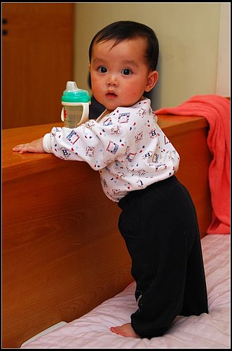 就在前幾天(4/25)小寶哥的第二哥小牙又冒出來了,口水共共流,也開始愛扶著站,也開始對各種東西感到好奇,學習力也大大進步許多,隨便教他個什麼東西,一下子就學會了。最近學會的是拿著小車車學F1呼嘯而過的聲音,整天在嗯~~~嗯~~的叫!昨天又教他BYE-BYE,在沒有人看他時,拚命的說88,加上手指上下握的動作,等到真的要說88時,又害羞的傻笑流口水,等人都走了,才在自己又說88加手的動作!